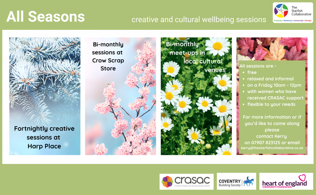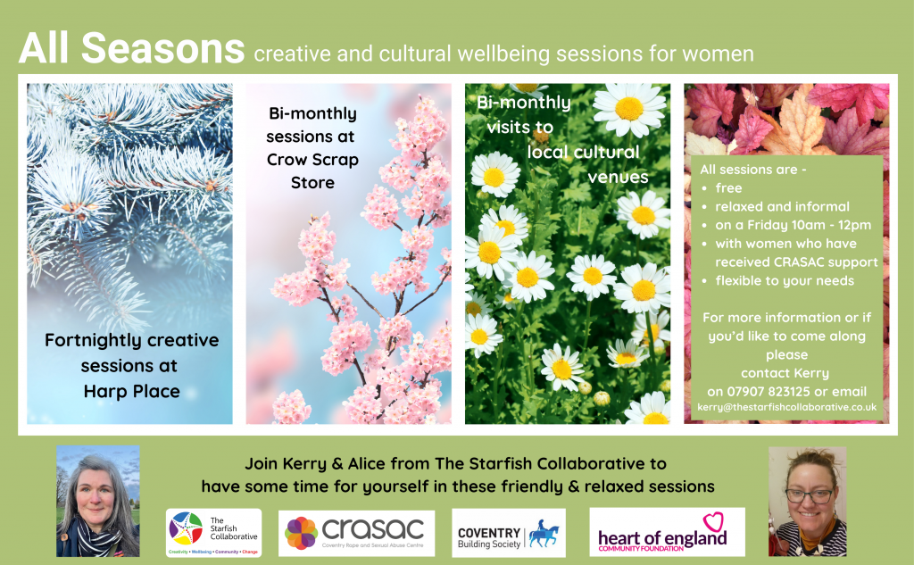 Funded by Coventry Building Society through the Heart of England Community Foundation and continuing our partnership with CRASAC, All Seasons is co-designed by women who have been supported by CRASAC and runs from September 2025 through to July 2026.